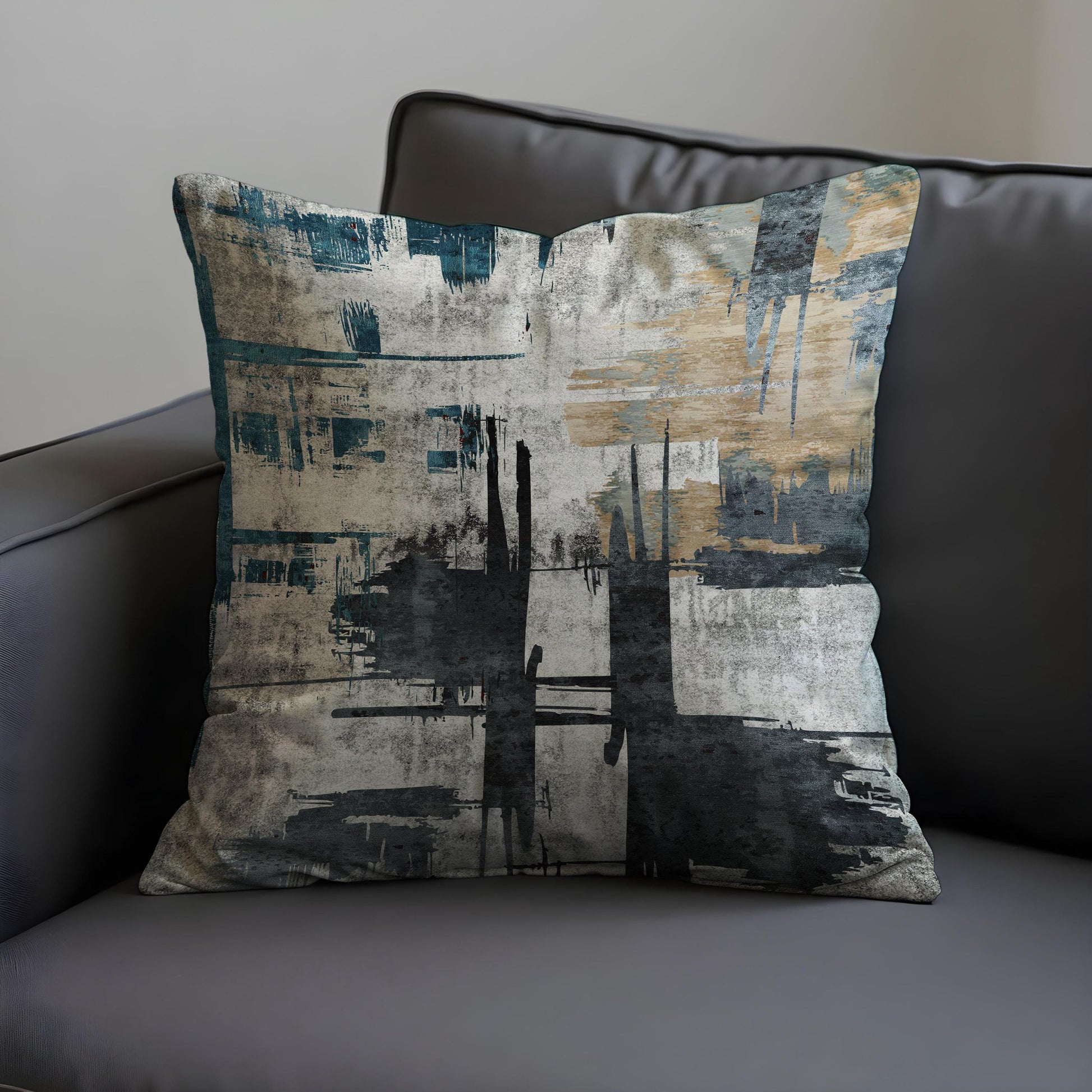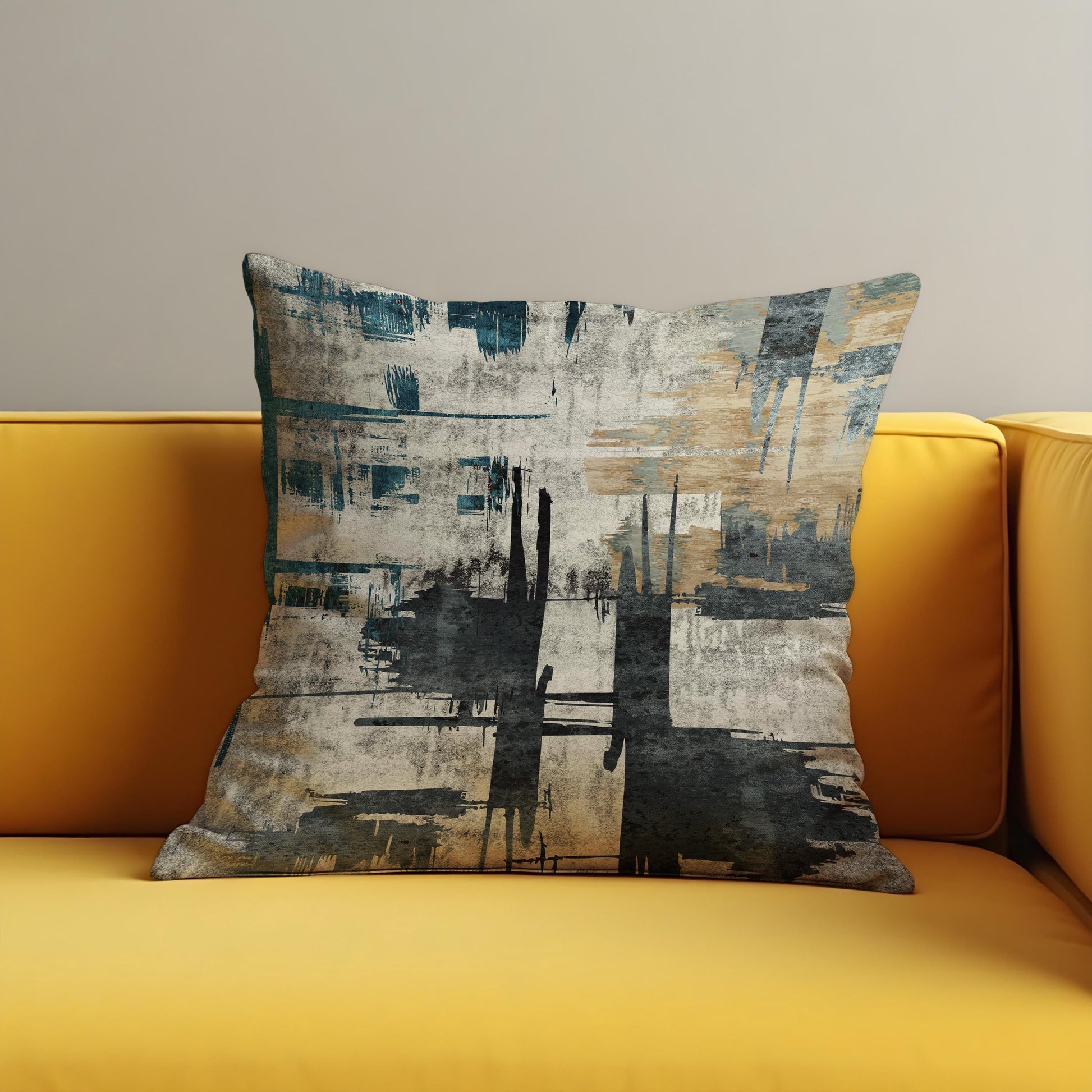 Featuring distressed brush strokes in charcoal black, muted teal, sandy beige, and concrete grey, this grunge inspired design evokes the textured beauty of weathered walls and urban structures. Perfect for loft style, modern, and minimalist interiors.