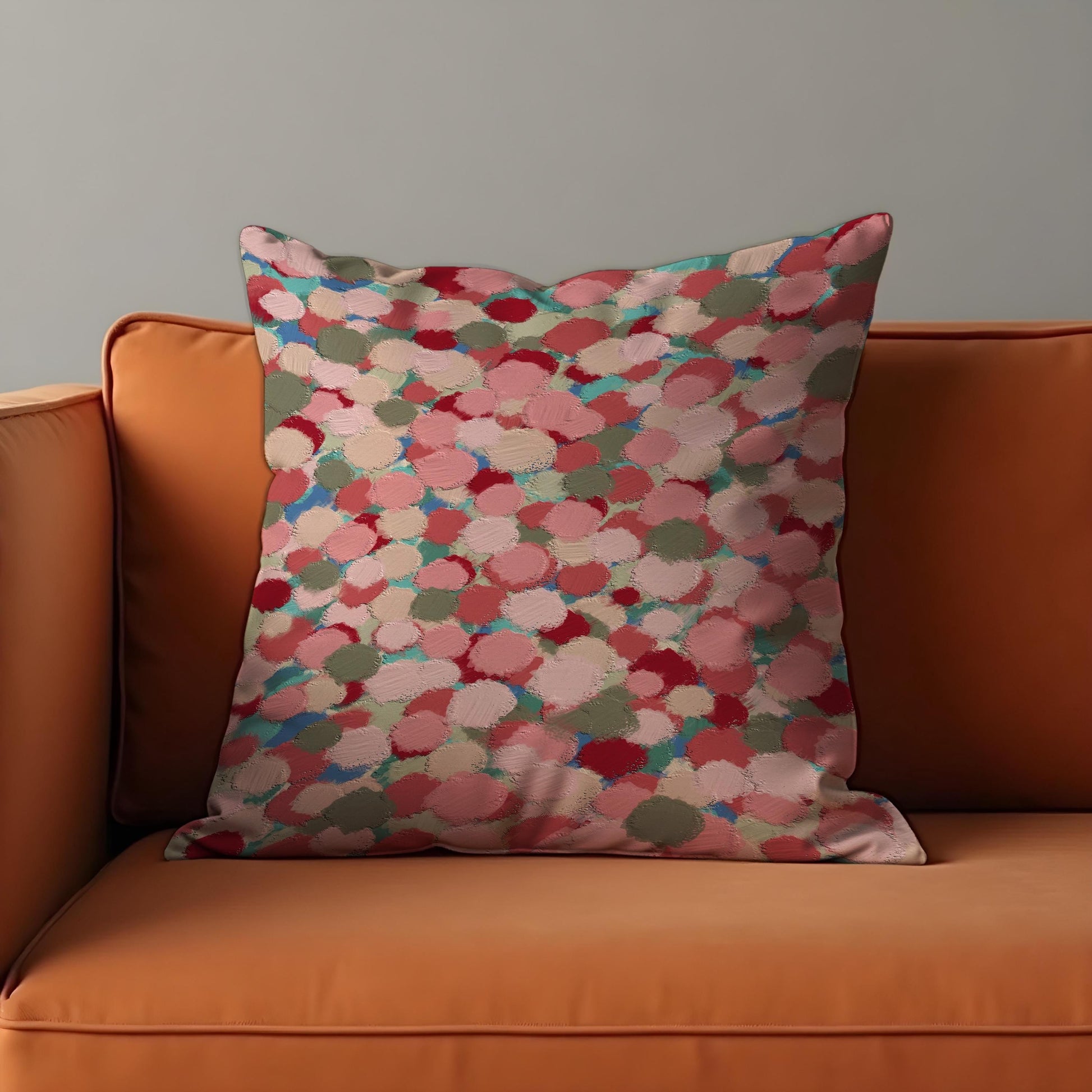 Infuse your space with artistic flair using this abstract brush dot cushion cover. Featuring a playful composition of hand painted circular strokes in blush pink, coral red, olive green, and soft beige, this pillow adds texture and movement to any room.