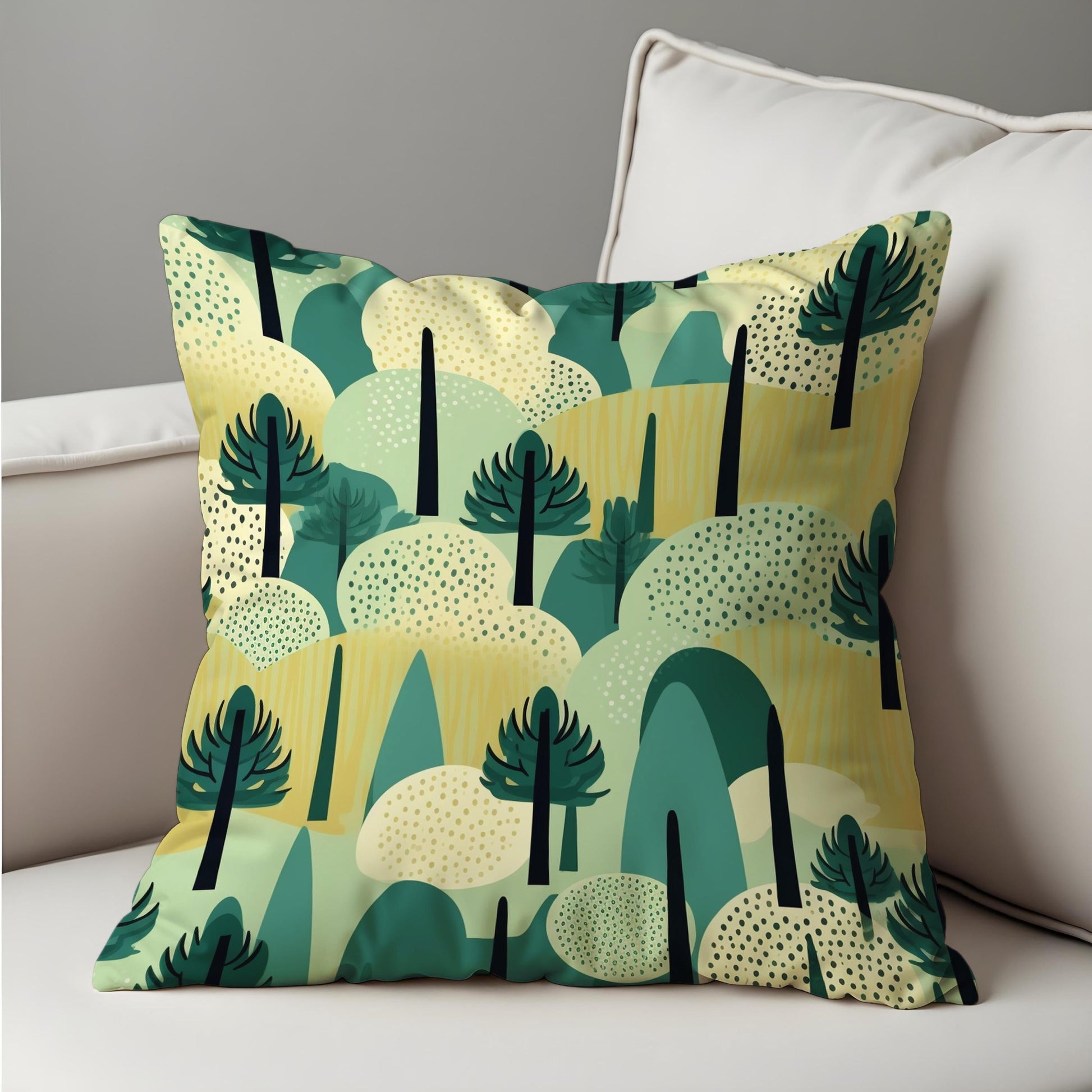 Step into a dreamy woodland with this artistic forest cushion cover! Featuring a modern, abstract landscape of rolling green hills, dotted textures, and tall, stylized trees in soft greens and warm yellows, this unique design adds depth, charm, and playfulness to your decor.
