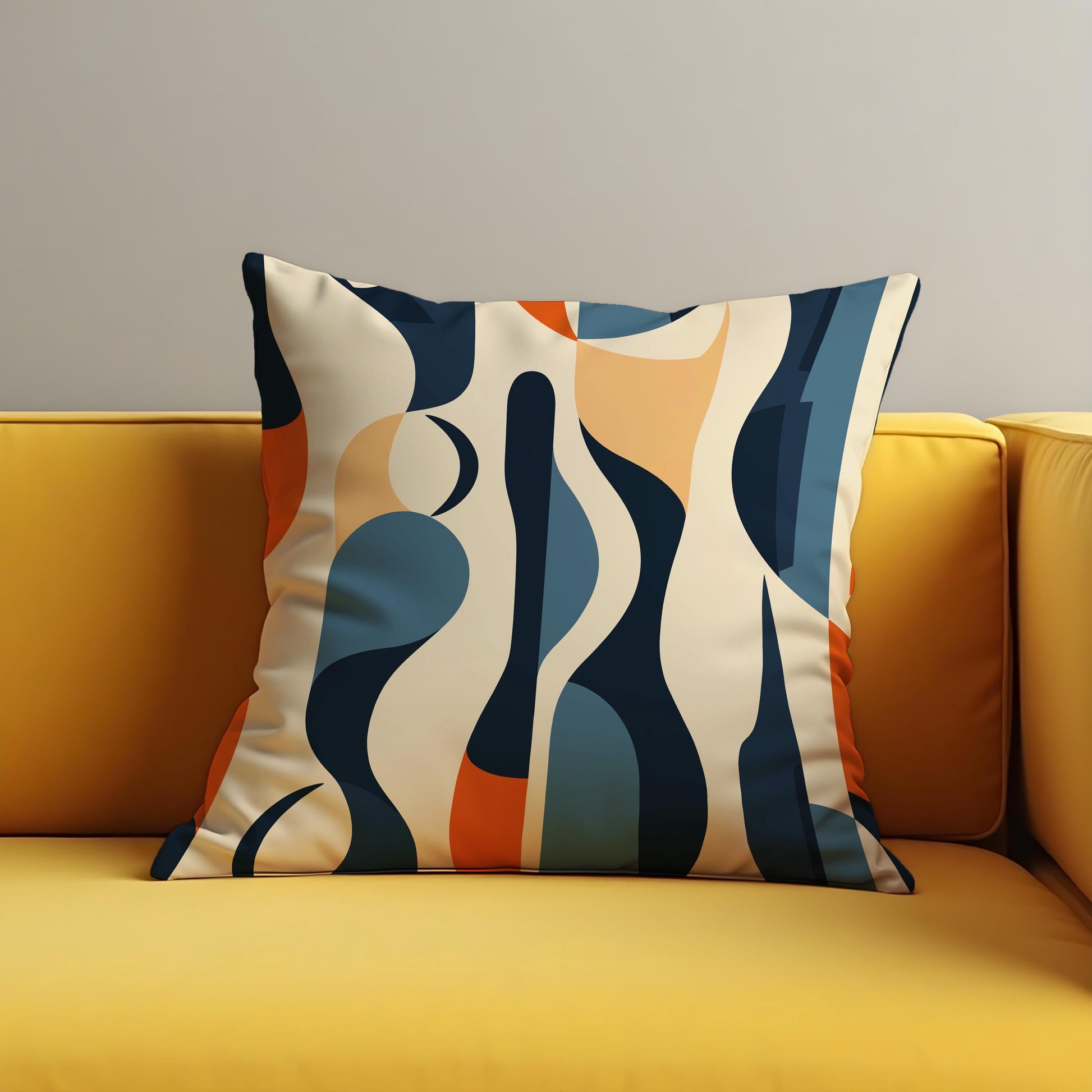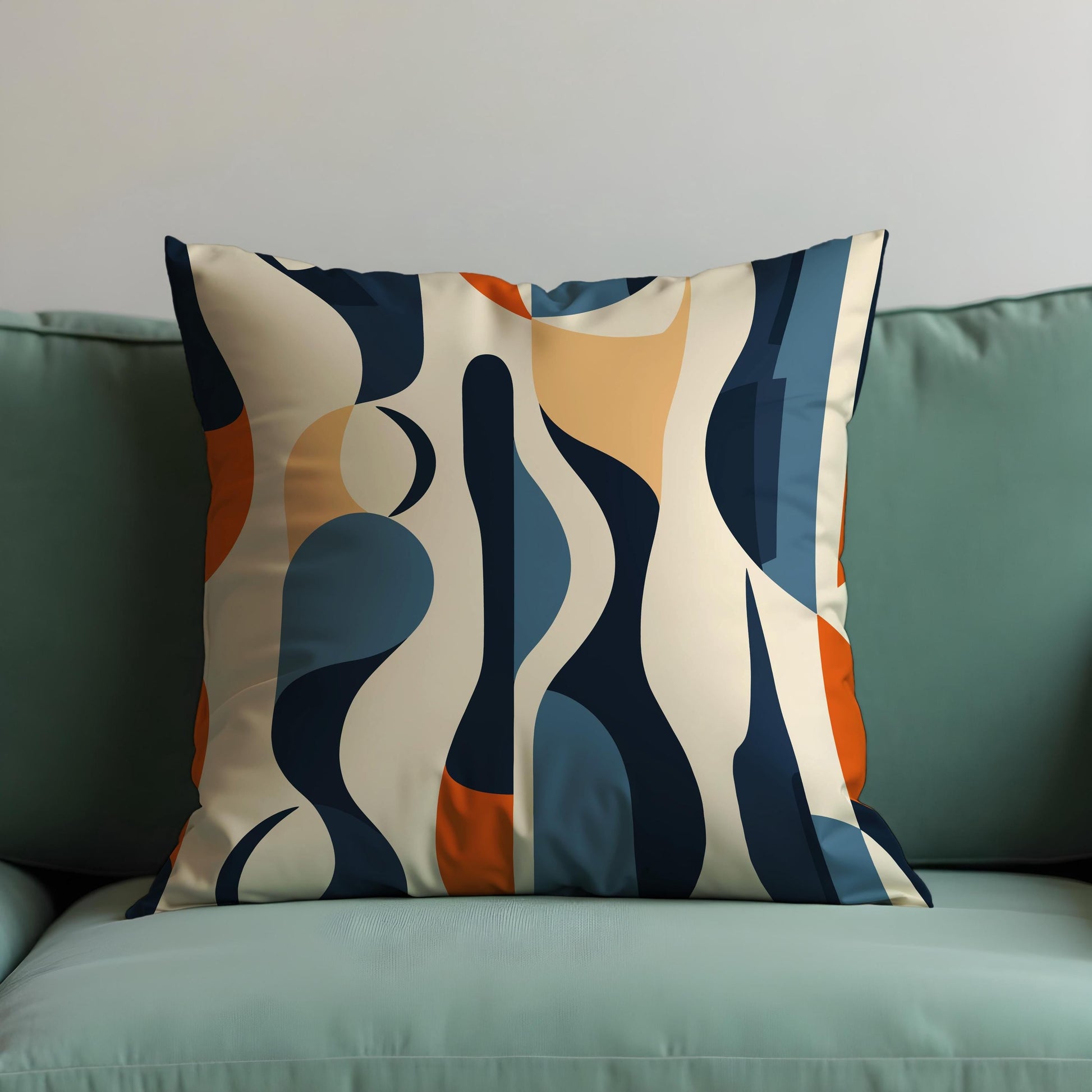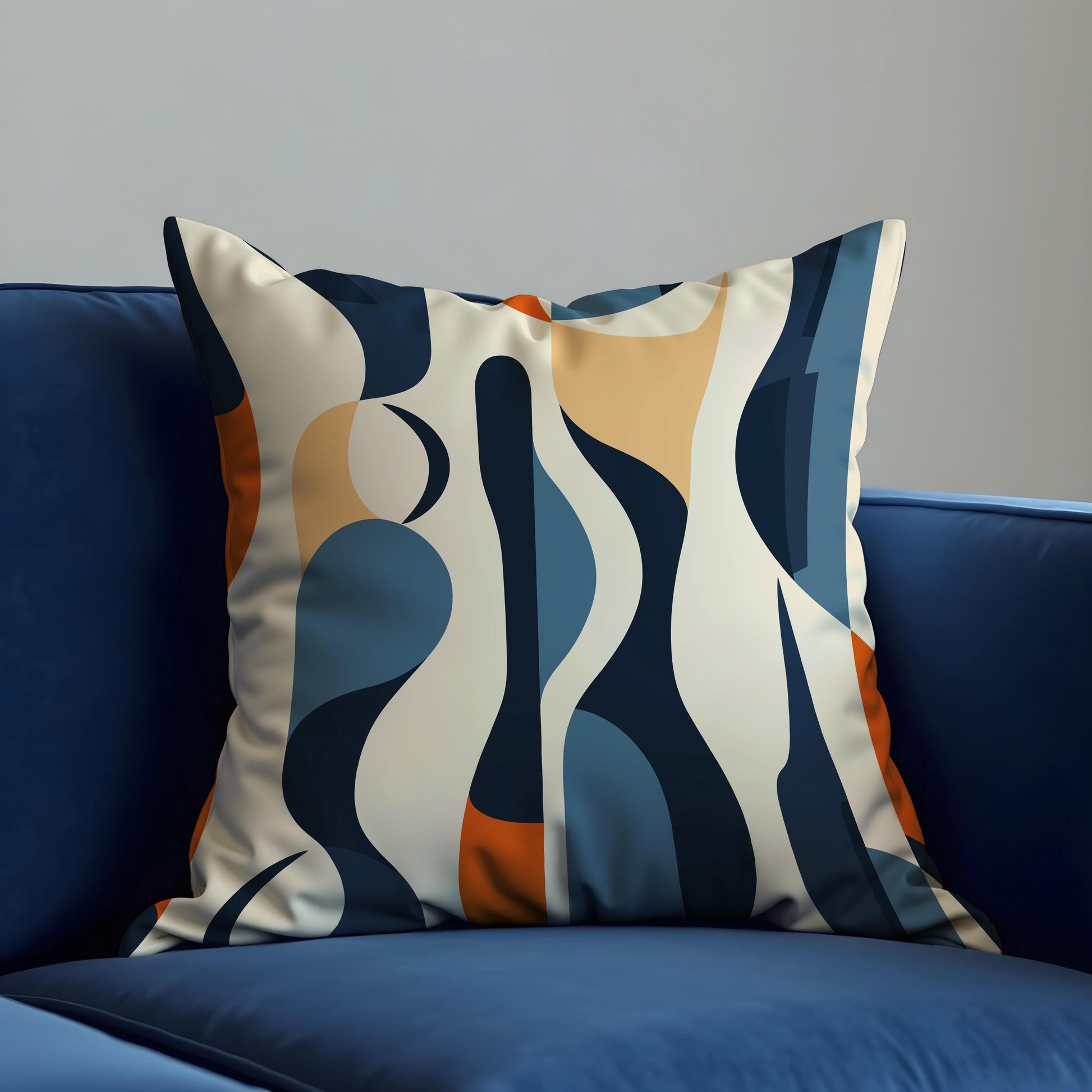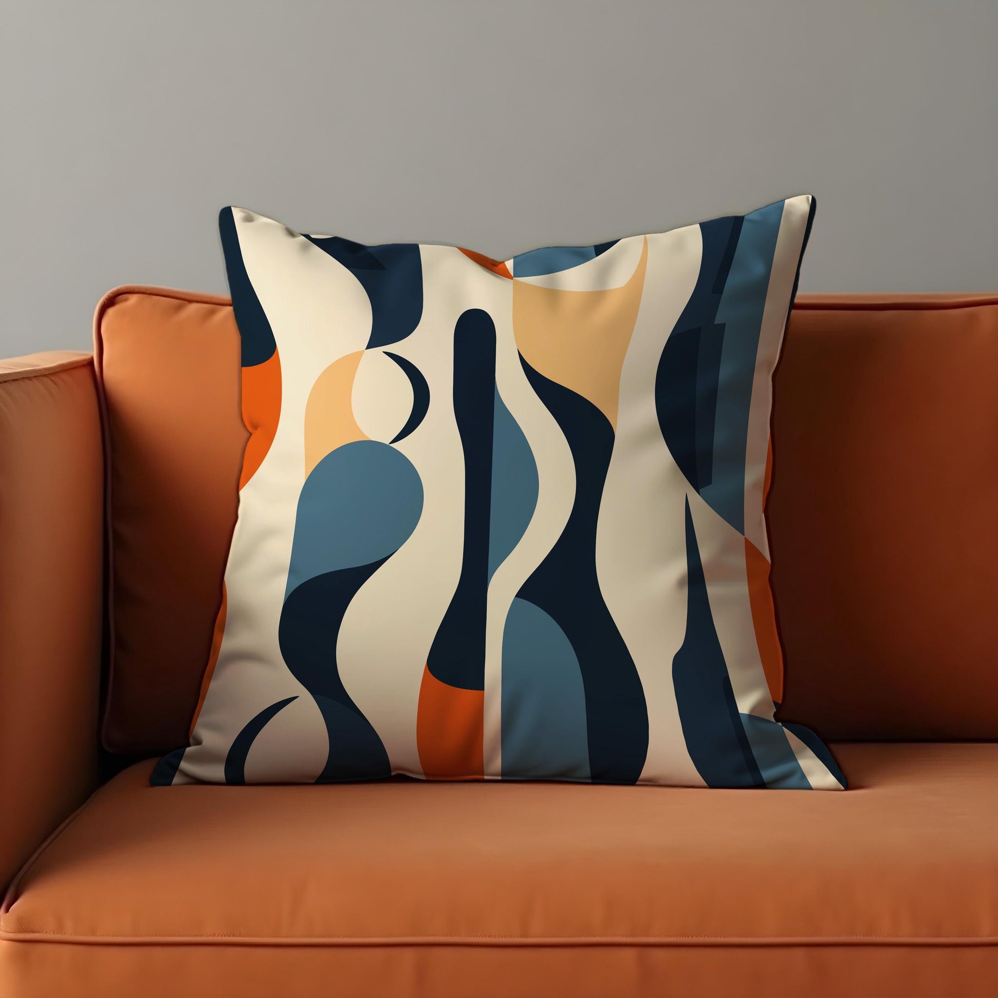 This eye catching cushion features a sophisticated wavy design in navy, rust orange, beige, and muted blues creating a sense of movement and modern artistry that adds depth and personality to any room.