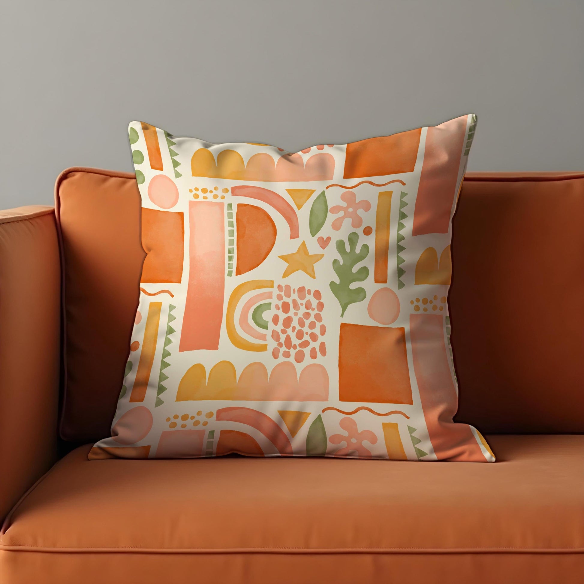 This abstract cushion cover features a joyful mix of peach, orange, blush, and sage tones in a hand painted, collage style design. Full of whimsical shapes and organic forms, it's perfect for adding a touch of fun and creativity to your décor.