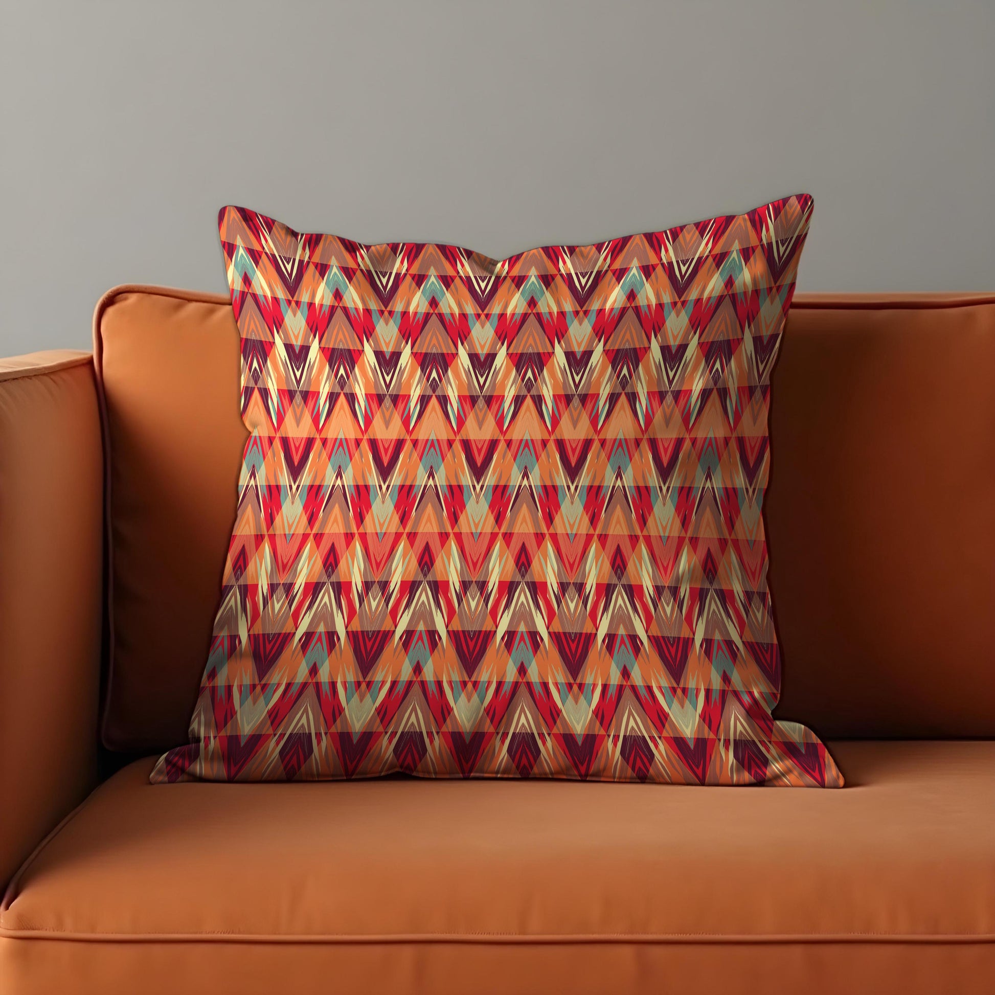 Add warmth and movement to your space with this bold tribal chevron cushion cover! Featuring a layered, arrow like geometric pattern in fiery shades of red, orange, burgundy, and touches of teal, this eye catching design evokes traditional craftsmanship with a modern edge.