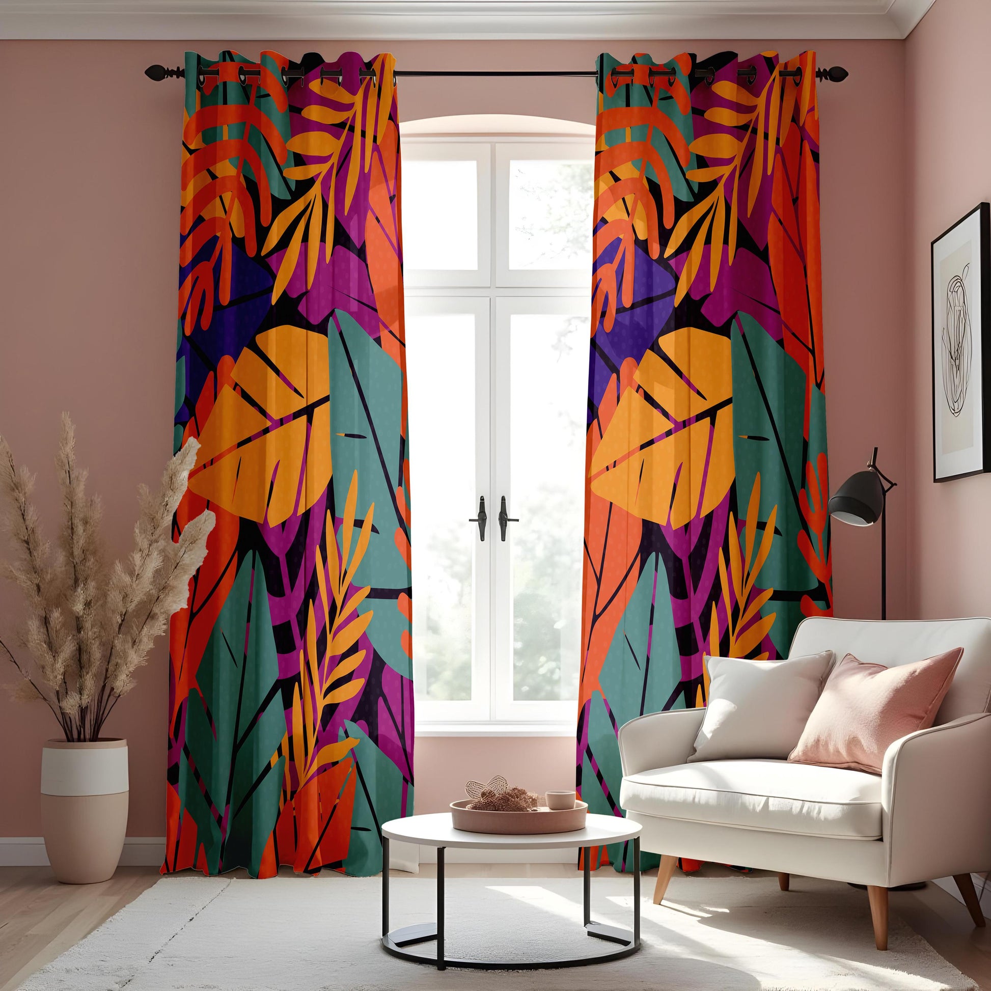 Bold Tropical Print Curtains, Abstract Colorful Leaves Drapes