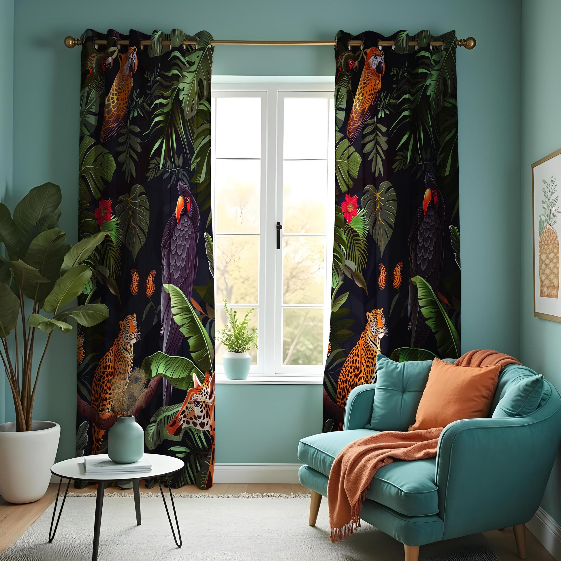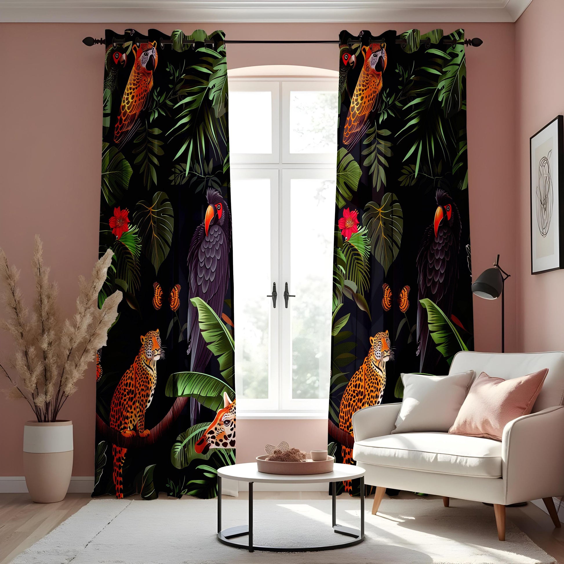 Elevate your home décor with these stunning jungle-themed curtains, featuring vibrant parrots, leopards, and lush tropical foliage. Perfect for creating a bold, safari-inspired ambiance, these drapes bring the wild beauty of nature indoors!