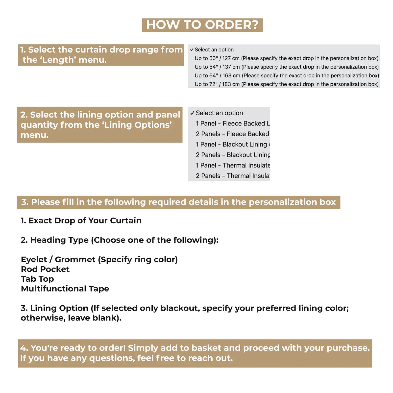 Returns & Exchanges: As all our curtains are made to order, we do not accept returns or exchanges unless there is a defect in the product.