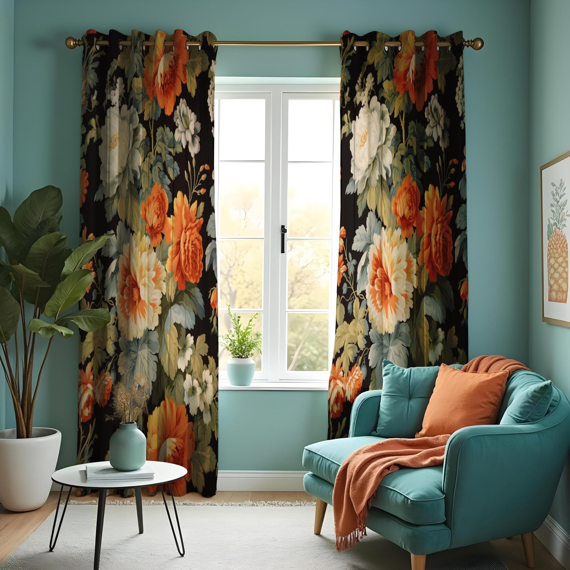 Add timeless sophistication and vintage charm to your space with this Dark Vintage Floral Curtain! Featuring lush orange and cream flowers with soft green foliage, set against a bold black background, these drapes create a dramatic and elegant aesthetic.