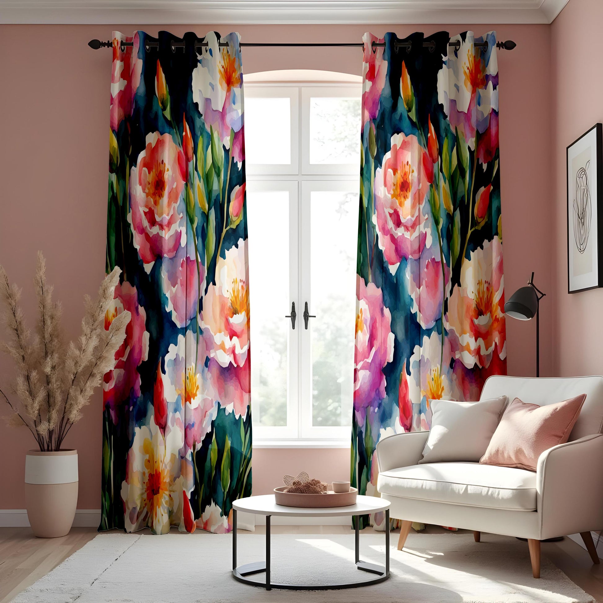 Enhance your space with the stunning beauty of hand-painted florals with this Watercolor Floral Curtain! Featuring bold peonies and botanical accents in a lush mix of pink, white, and yellow blossoms against a deep navy blue background, these drapes create a vibrant yet elegant ambiance.