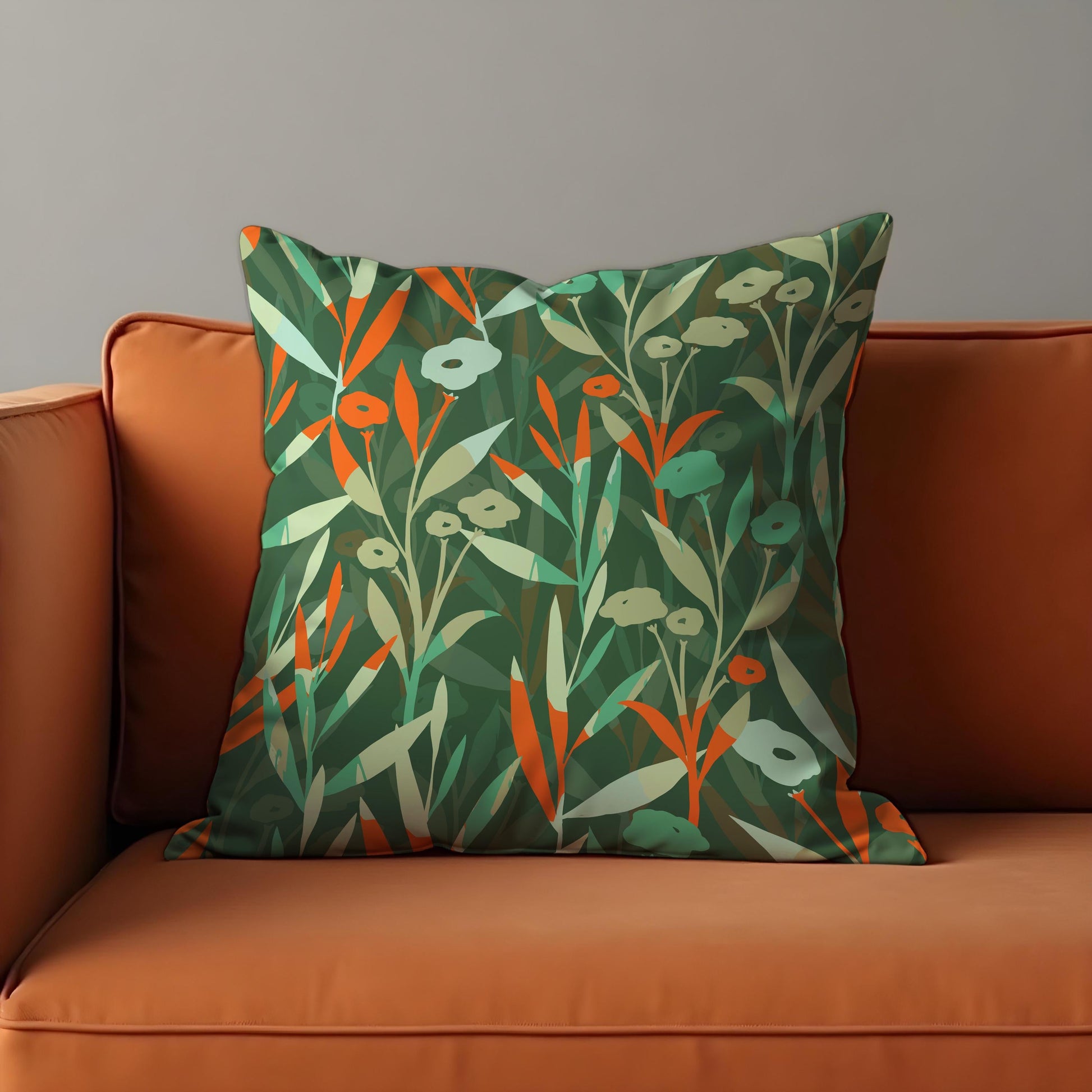 Featuring a stylized jungle print in deep green tones with pops of burnt orange and teal, this design evokes modern tropical elegance perfect for nature lovers and boho interiors.