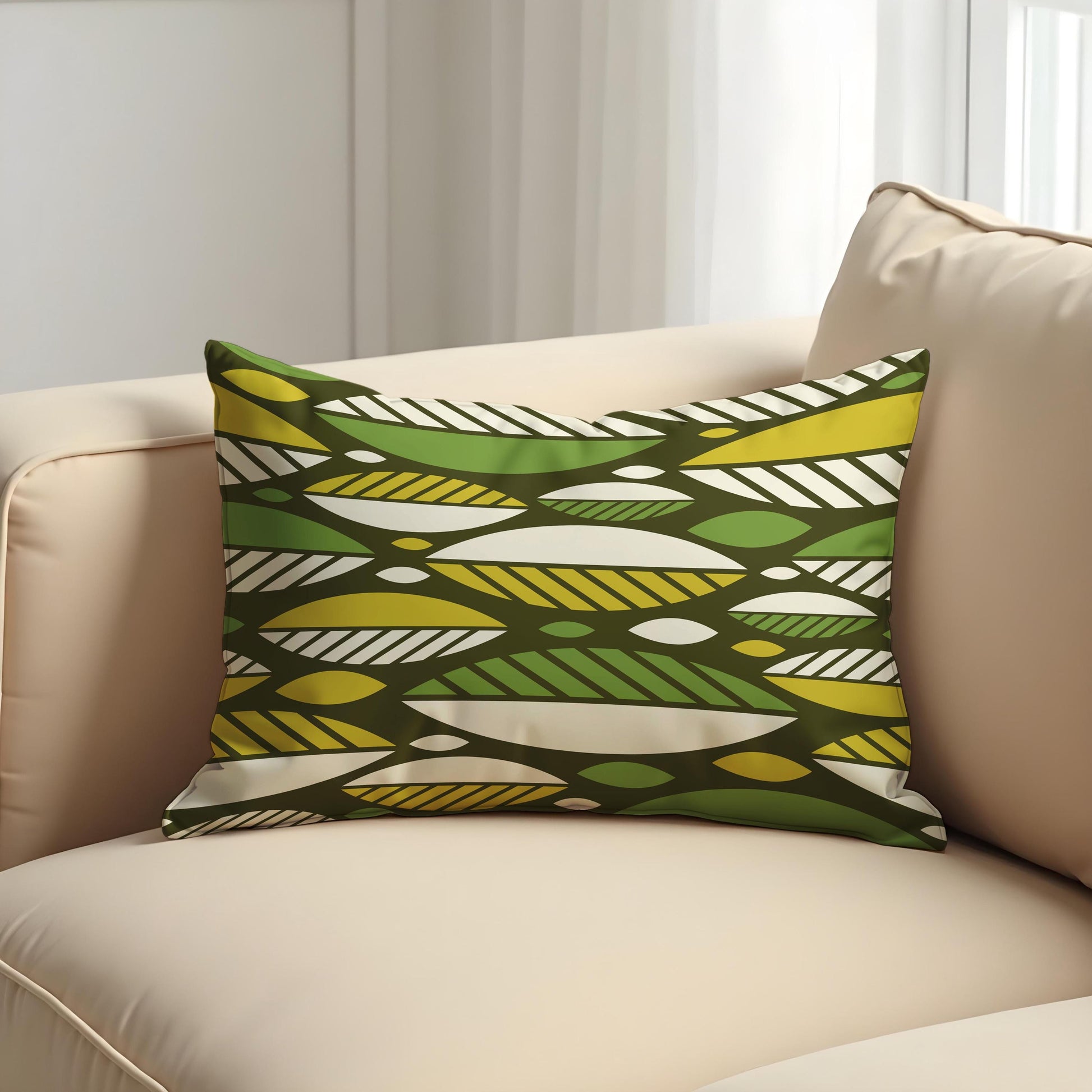 Add a pop of modern charm to your decor with this Modern Geometric Cushion Cover, featuring a bold, abstract pattern in rich earth tones. With overlapping shapes in olive green, mustard yellow, cream, and chartreuse this design draws inspiration from mid century modern aesthetics while keeping a fresh and artistic vibe.