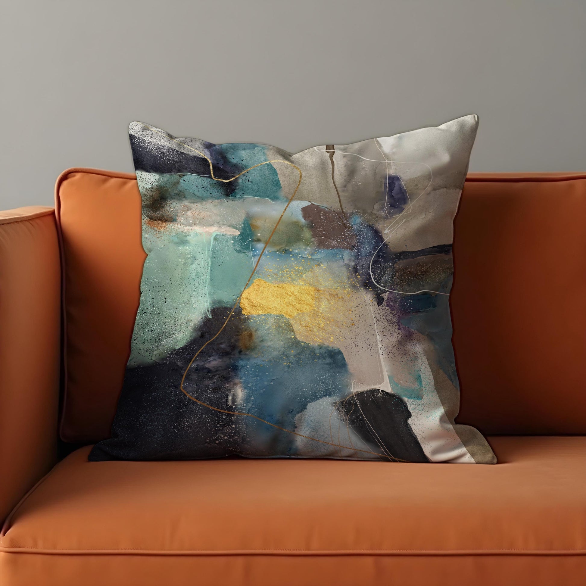 Immerse your space in atmospheric elegance with this moody abstract watercolor cushion cover. Featuring deep blues, charcoal black, soft beige, hints of violet, and a splash of golden yellow, this design mimics the look of fluid inks and cosmic skies. Perfect for modern, luxe, or boho interiors that embrace depth and artistry.