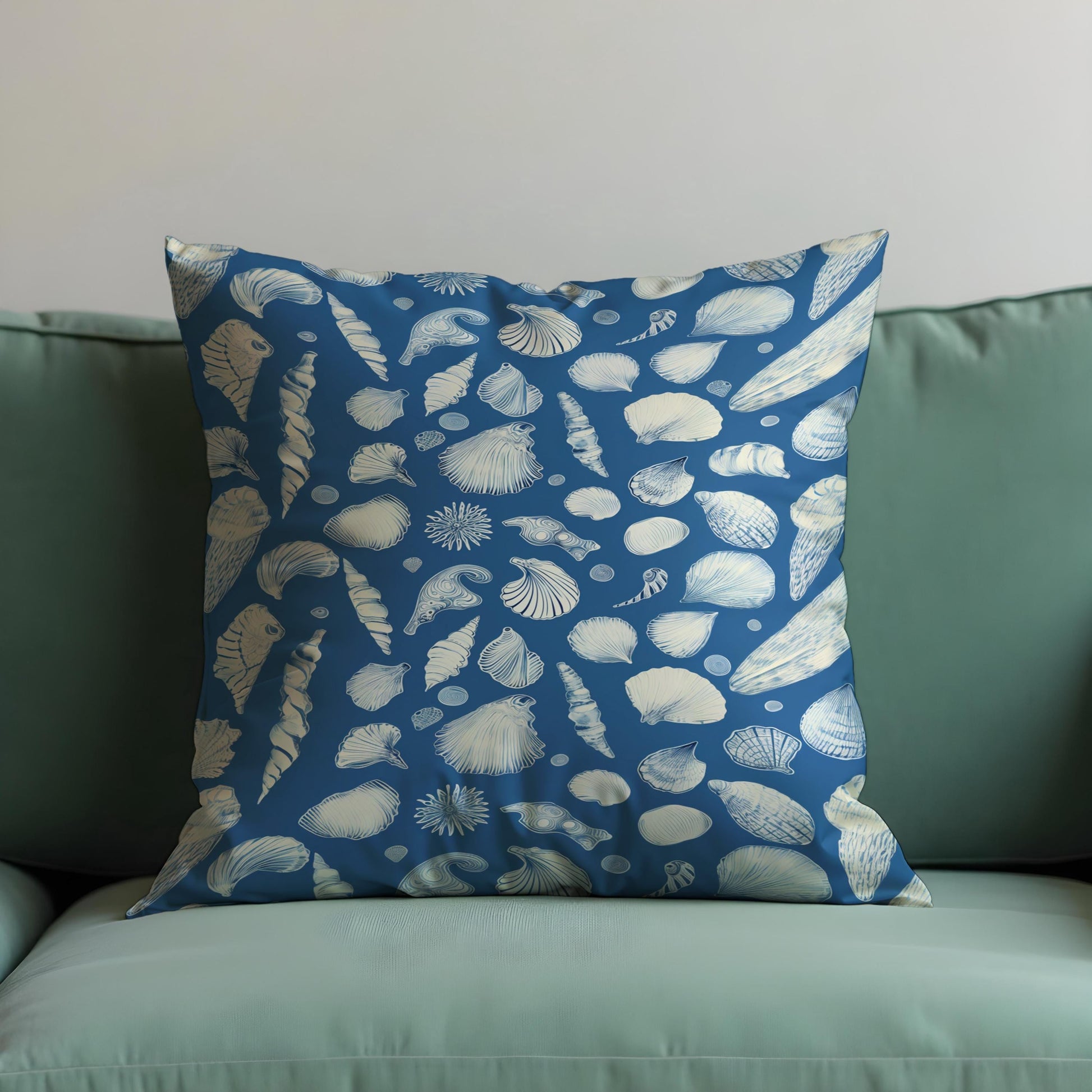 Bring the serene charm of the ocean to your home with this nautical seashell cushion cover. The deep sea blue background is adorned with intricate white shell illustrations, perfect for beach themed or coastal inspired decor.