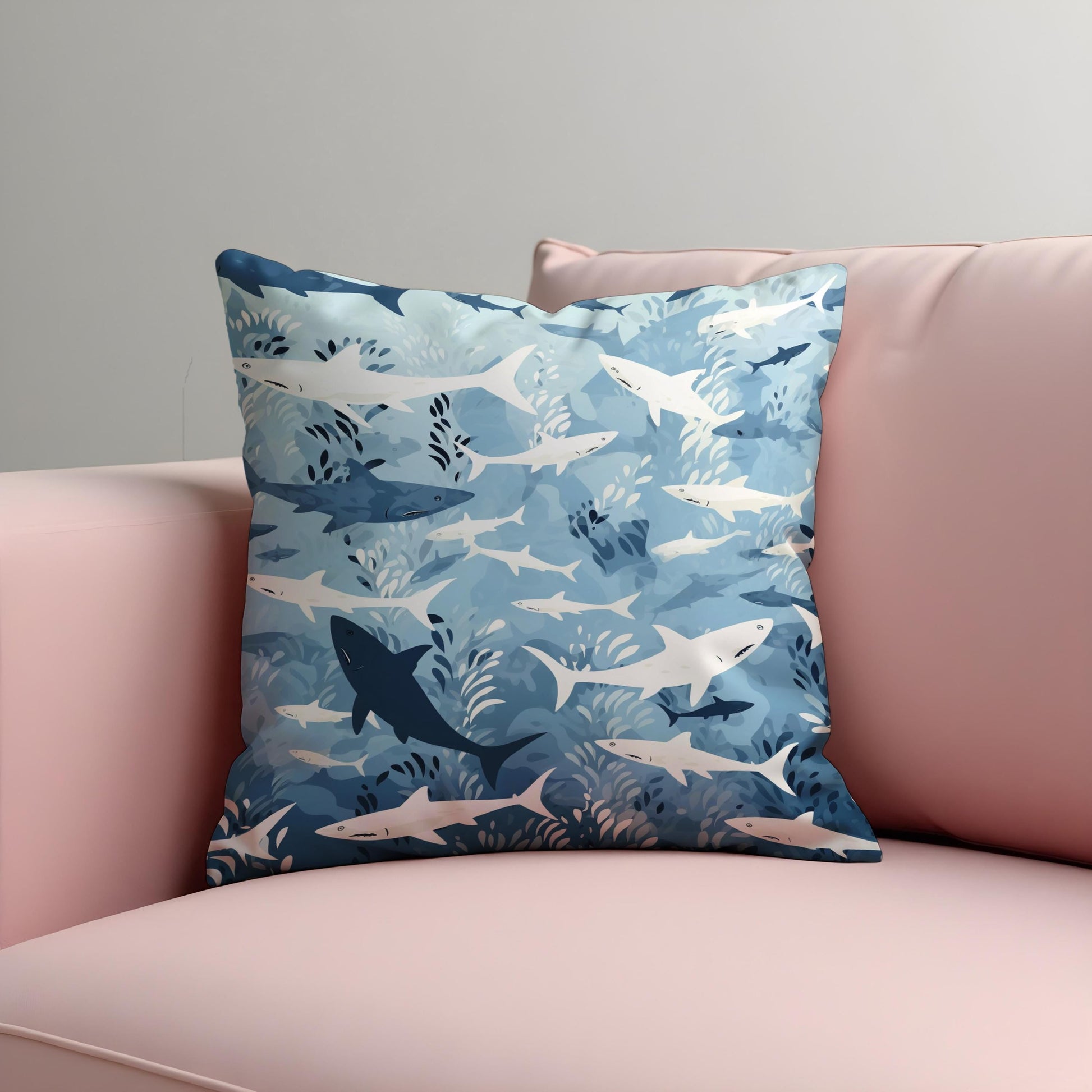 Make waves with this playful shark themed cushion cover, perfect for ocean lovers big and small! Featuring a lively school of sharks in soft shades of blue and white on a sea blue backdrop, this aquatic design brings underwater adventure to coastal homes, kids' bedrooms, or beach cottages.