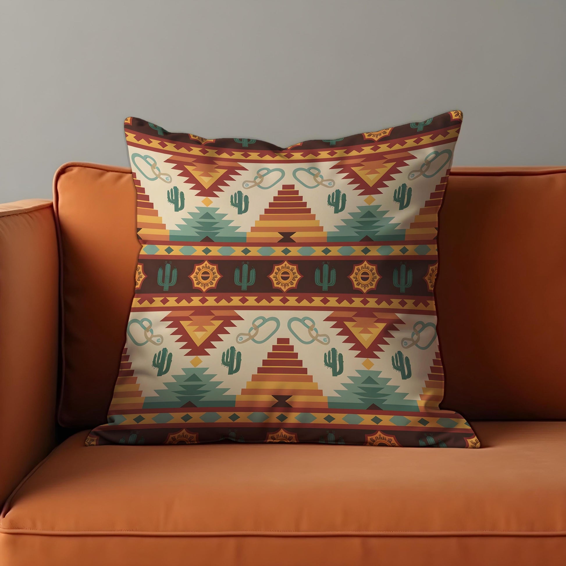 Bring the spirit of the desert into your home with this Southwestern Desert Cushion Cover, featuring classic tribal motifs, cacti, and sheriffs' badges in warm, earthy tones. The vibrant mix of terracotta, mustard, teal, and cream evokes the beauty of the American Southwest, making it a striking accent piece for any rustic, boho, or western themed space.