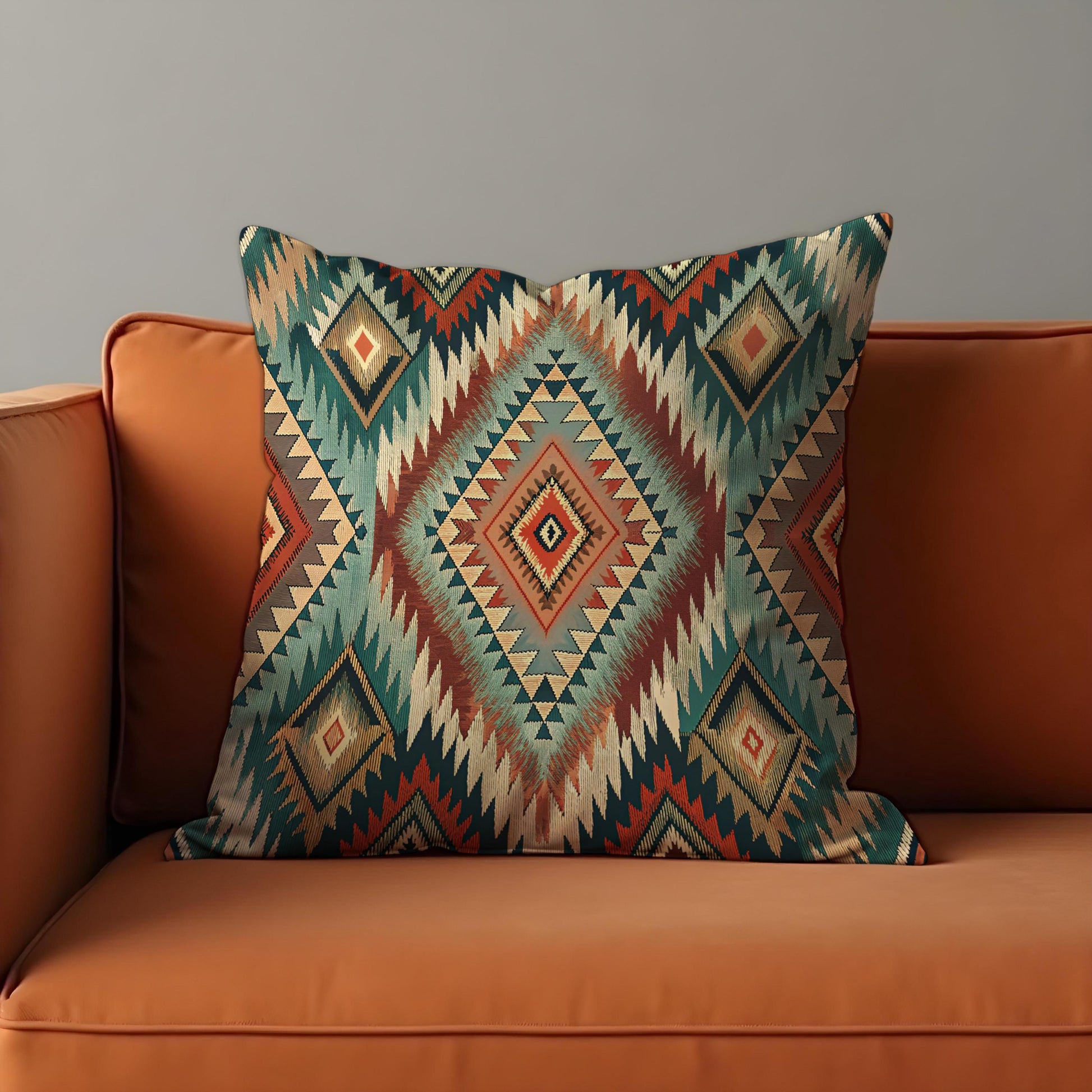 Bring timeless desert style into your home with this Traditional Southwestern Diamond Cushion Cover, featuring intricate tribal diamond motifs in rich tones of teal, rust orange, beige, and black. Its detailed pattern and earthy color palette make it a striking centerpiece for rustic, boho, or western themed spaces.