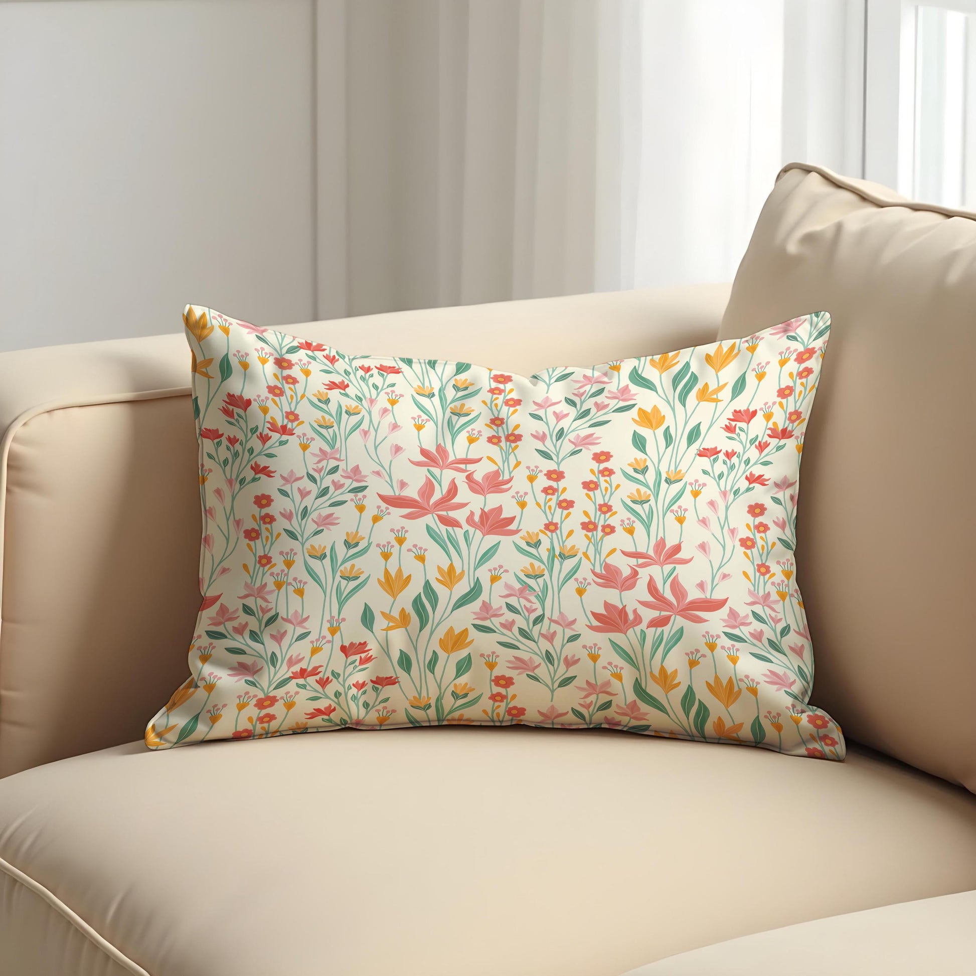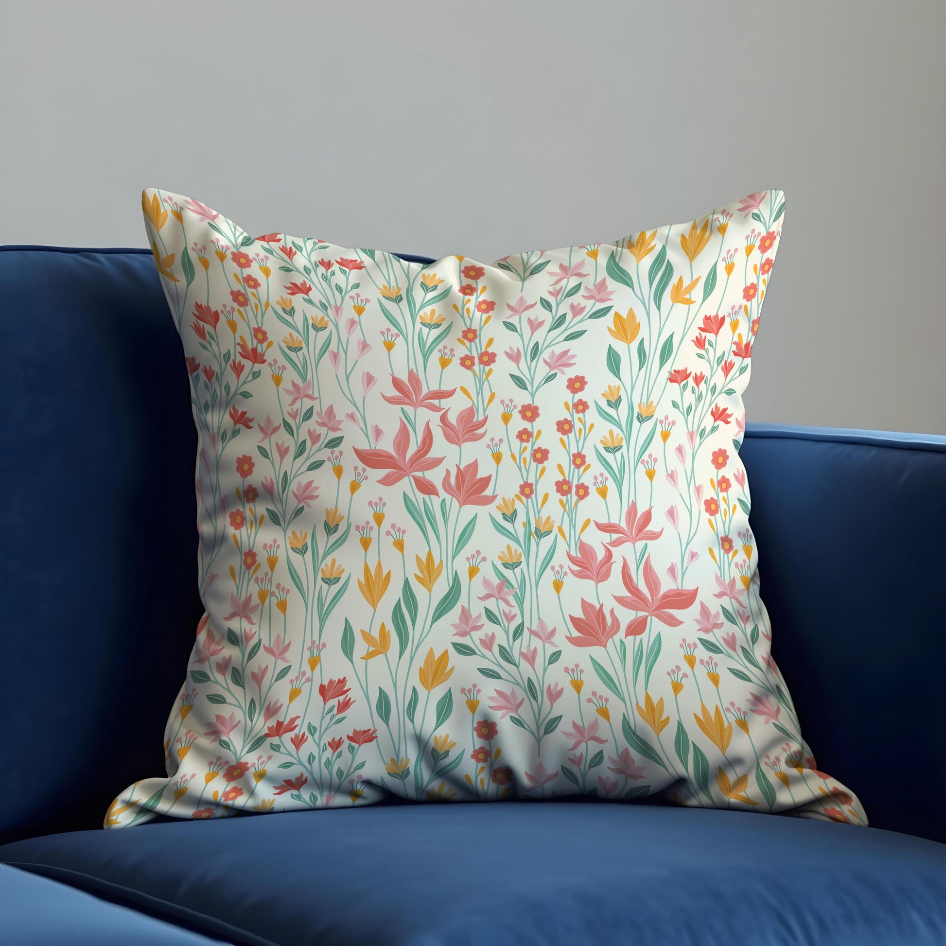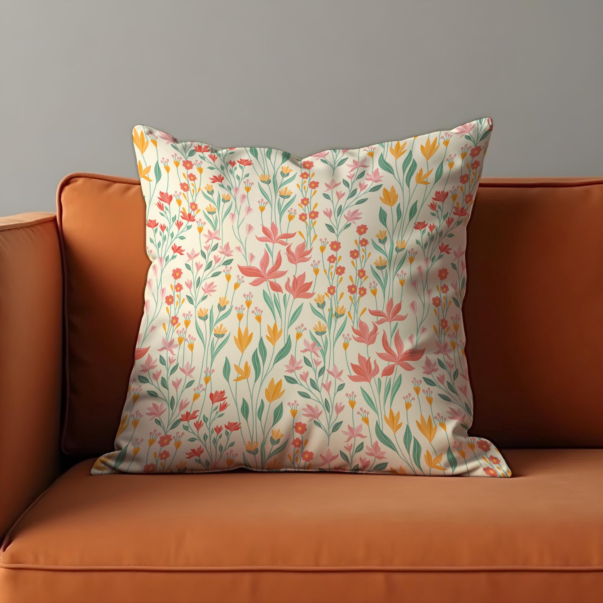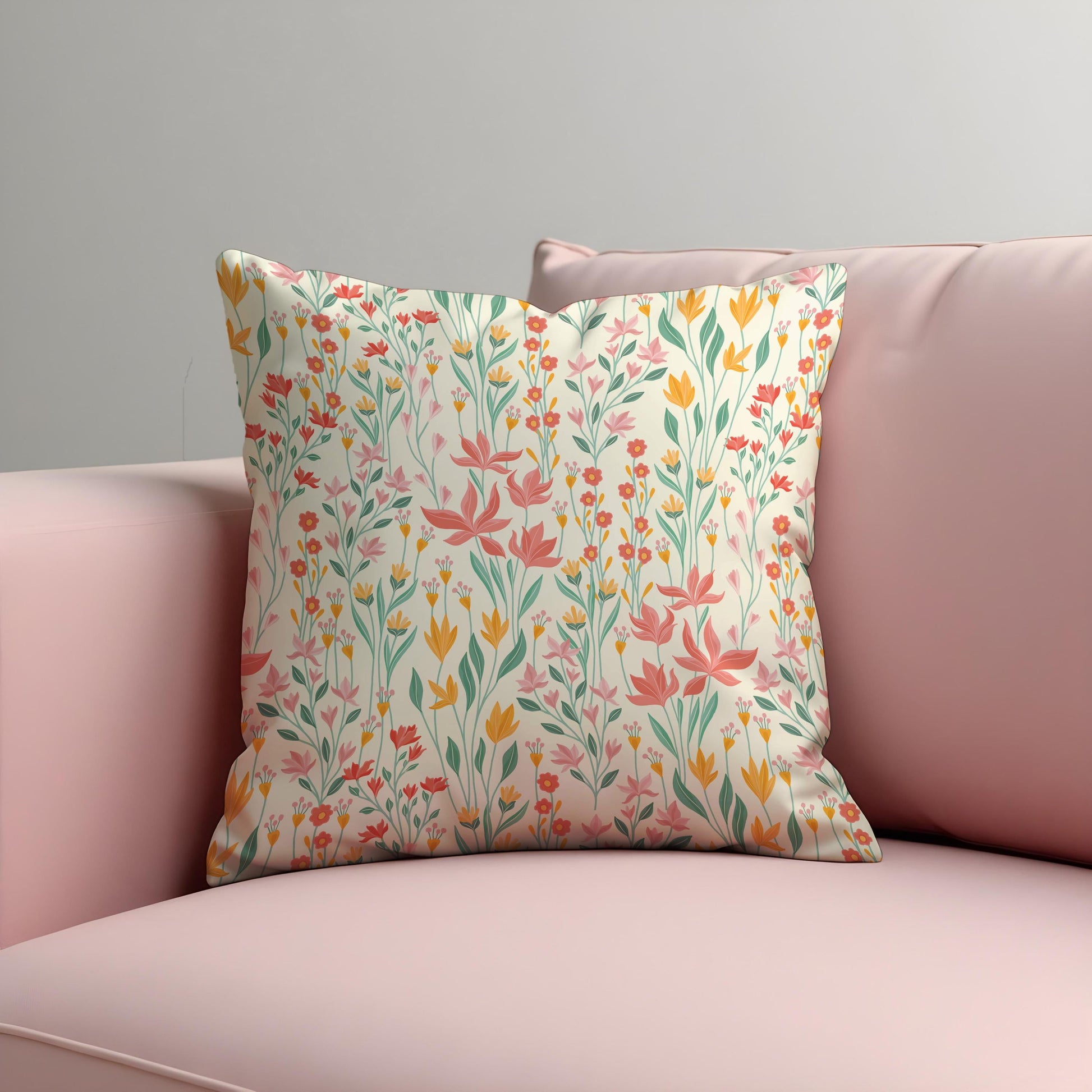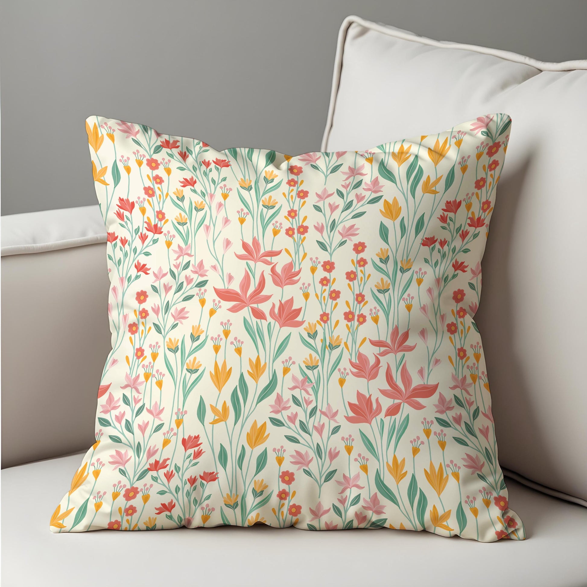 Welcome spring into your home year-round with this charming floral cushion cover! Featuring a delicate garden of pink, coral, yellow, and orange blooms with minty green leaves, this pattern brings a fresh and uplifting touch to any room.