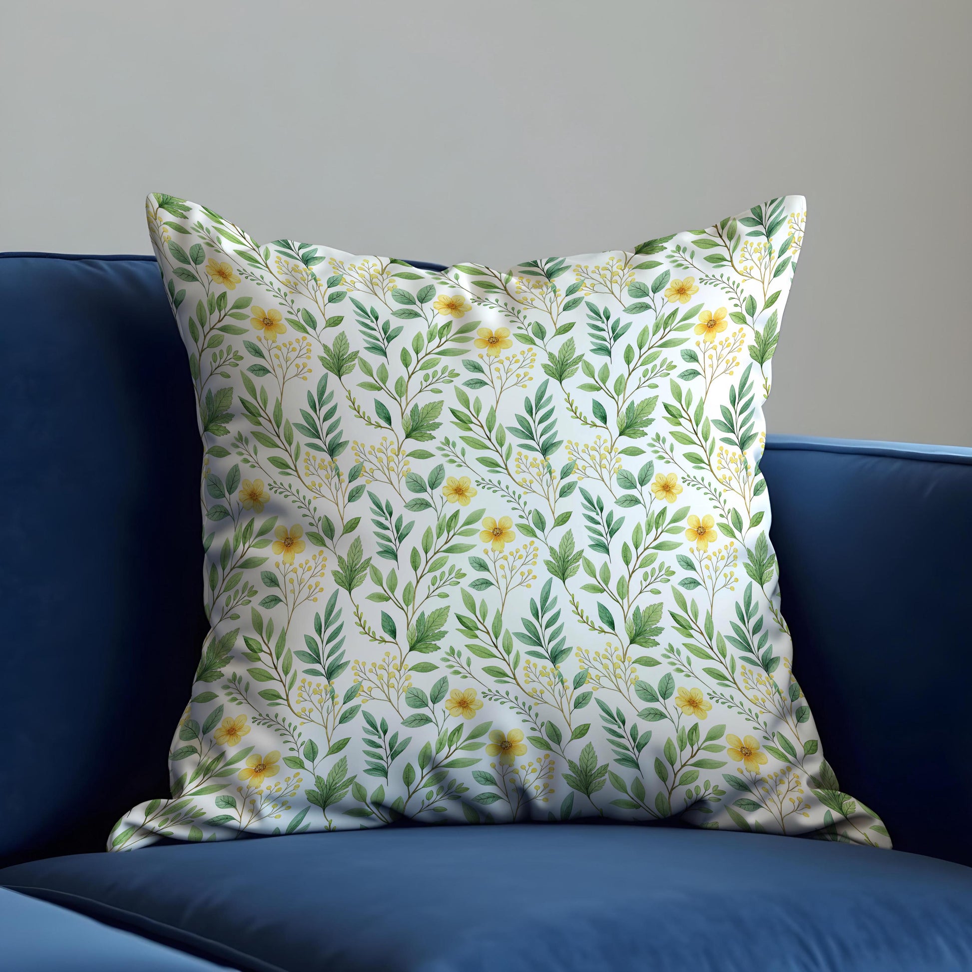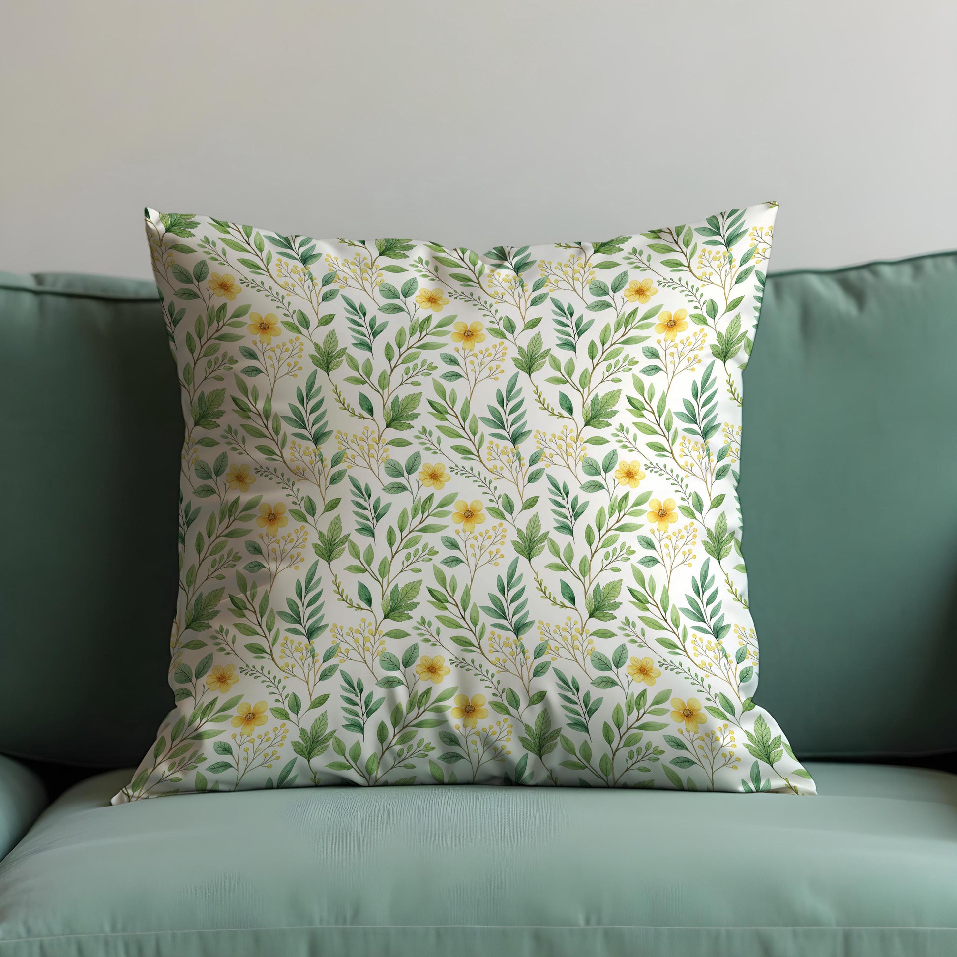 Spring Botanical Cushion Cover, Green Leaves & Yellow Floral Pillow Case