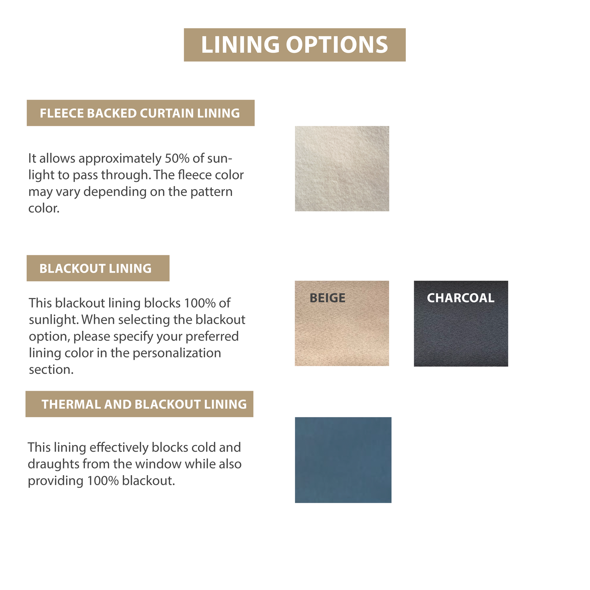 Our premium curtains are crafted from 100% polyester velvet fabric with a plush fleece backing, ensuring a soft texture and a luxurious feel. For added functionality, we offer blackout lining or insulated thermal and blackout lining to enhance privacy and energy efficiency.