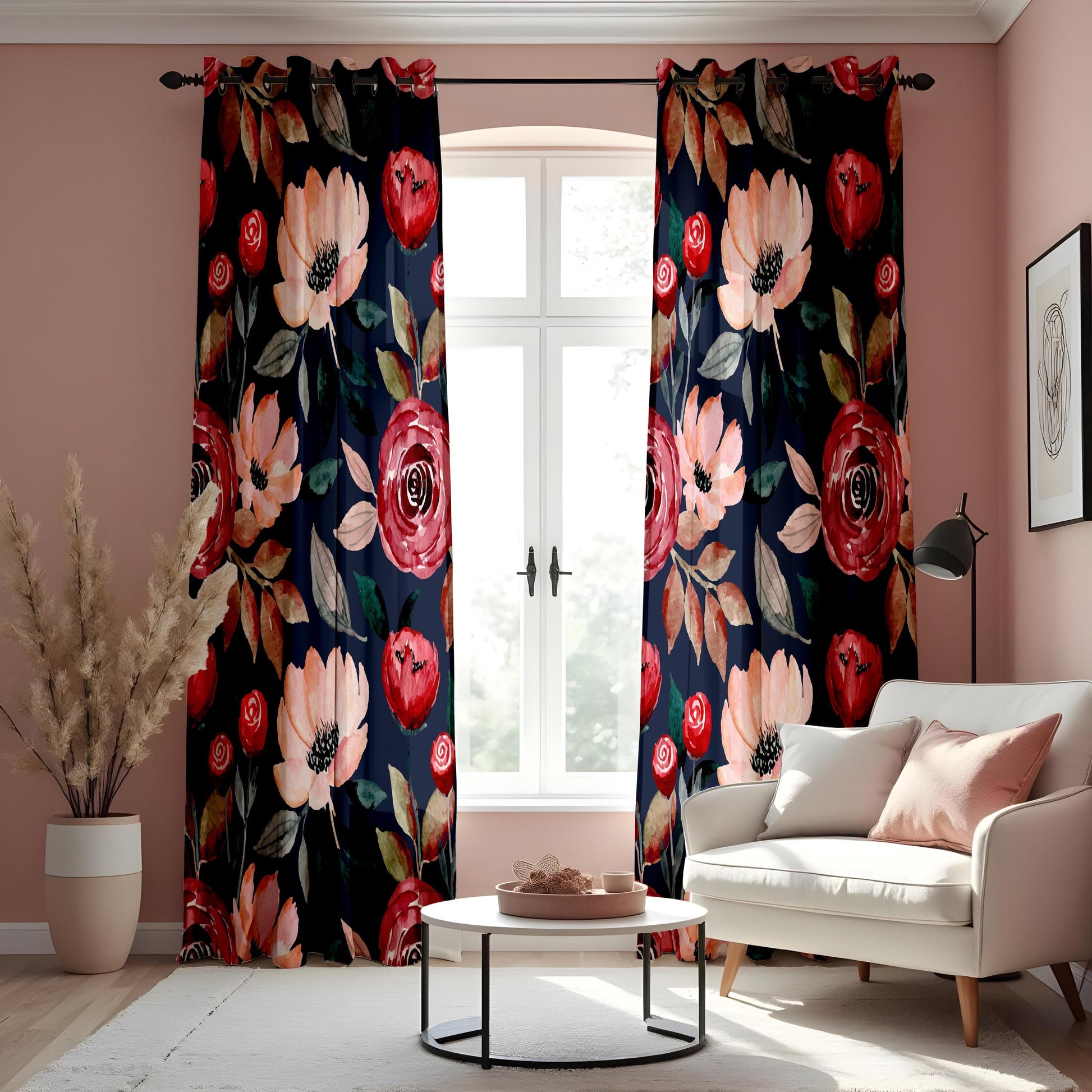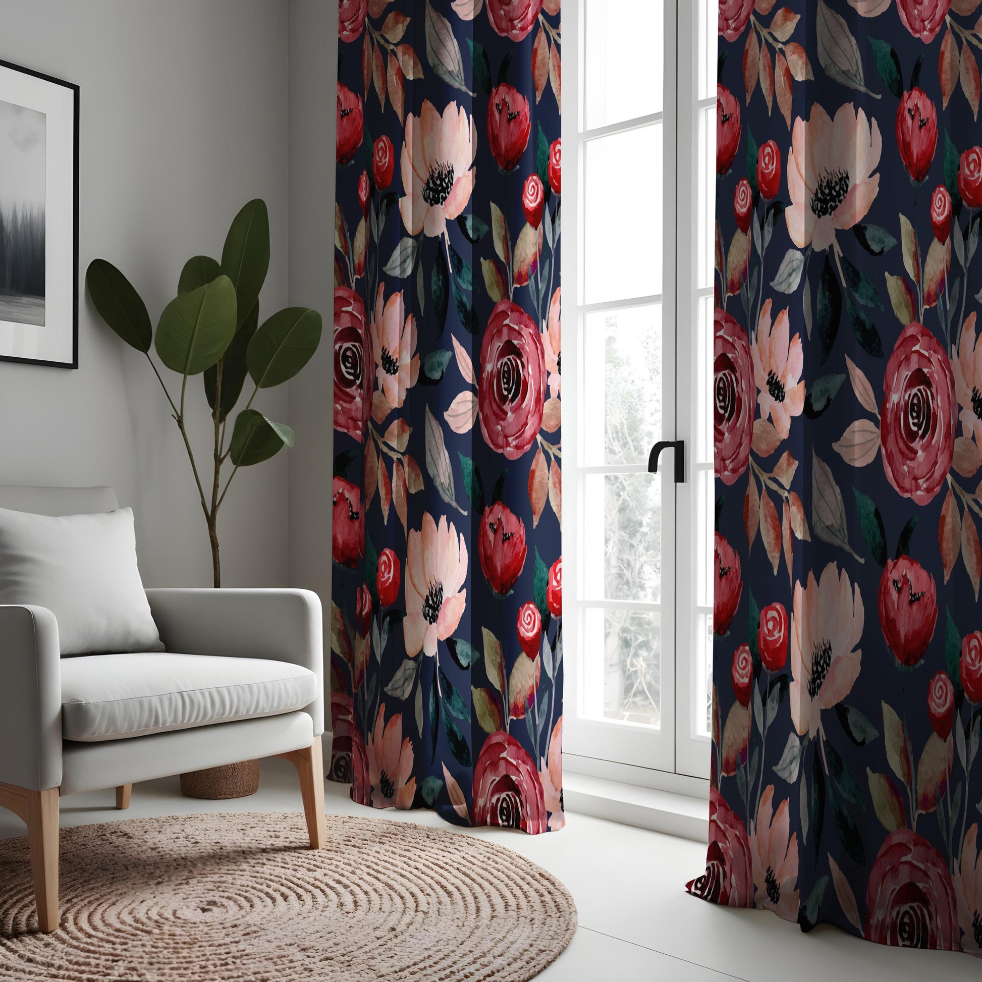 Watercolor Floral Curtains, Navy Blue & Red Romantic Rose Print Drapes